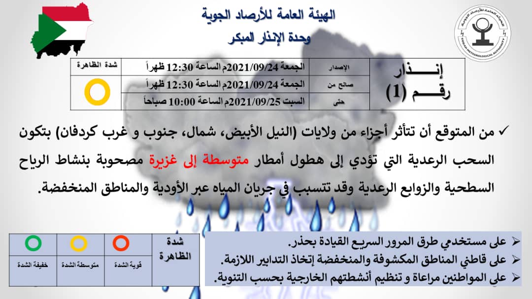 اصدرت وحدة الانذار المبكر بهئية الارصاد الجوي اليوم انذارا للمواطنين لاحذ الحيطة والحذر ..وقال رصدها لليوم الجمعة انها تتوقع تأثر اجزاء كبيرة من البلاد بالامطار خاصة ولايات النيل الابيض شمال وغرب وجنوب كردفان بتكون السحب الرعدية التي تؤدي الي هطول امطار متوسطة الي غزيرة مصحوبة بنشاط الرياح السطحية والزوابع الرعدية .وحذرت مستخدمي الطريق السريع القيادة بحذر ..وعلي قاطني المناطق المكشوفة والمنخفضة اخذ الاحتياط والحذر ..وعلي المواطنين تنظيم انشطتهم بحسب التنويه .