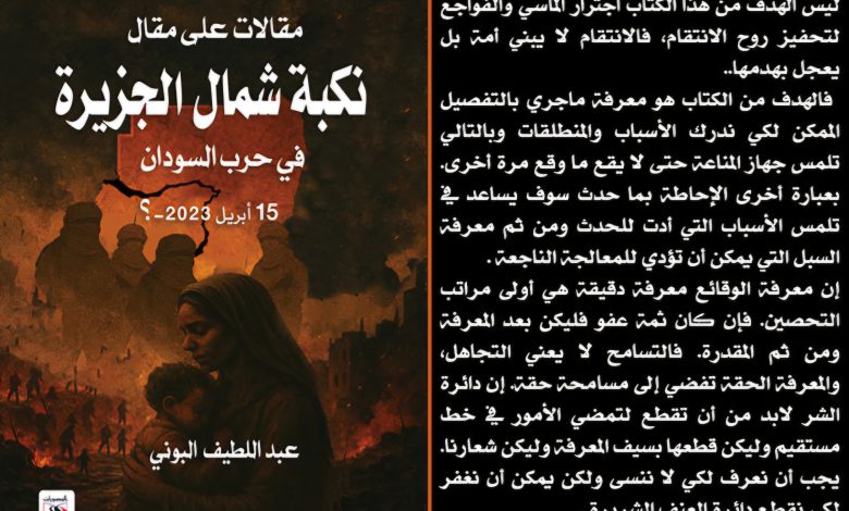 يعرض بمعرض الشارقة الدولي للكتاب ، اول كتاب يتناول مأساة منطقة شمال ولاية الجزيرة بعنوان:(نكبة شمال الجزيرة في حرب السودان ابريل 2023..) الكتاب محزن ويحكي بعض مآسي الحرب .وهو من تأليف دكتور عبداللطيف البوني. ويشارك بالكتابة فيه عدد من الصحفيين والكتاب الذين عايشوا احداث مؤلمة بالمنطقة .